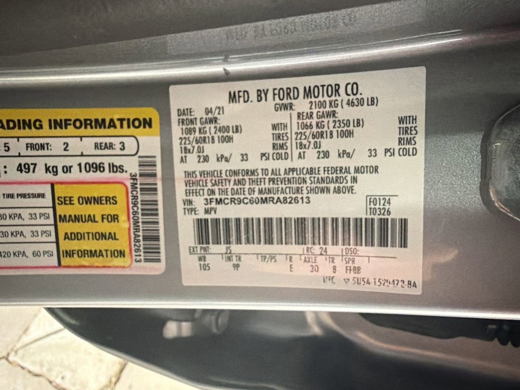 Vinyl/Rubber Floor Trim, Trip Computer, Transmission: 8-Speed Automatic, Transmission w/Driver Selectable Mode, Tracker System, Tires: 225/60R18 All Season BSW, Tire Specific Low Tire Pressure Warning, Tailgate/Rear Door Lock Included w/Power Door Locks, SYNC 3 Communications & Entertainment System -inc: enhanced voice recognition, 8" LCD capacitive touchscreen in center stack w/swipe capability, AppLink, 911 Assist, Apple CarPlay and Android Auto compatibility and smart-charging A (first row) and C (in the media hub) USB ports, Strut Front Suspension w/Coil Springs.